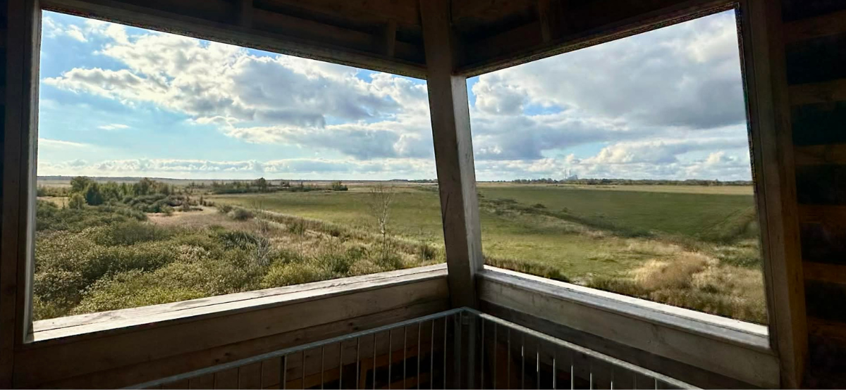 Fra toppen åbner landskabet sig i skønhed over Kalvebod Fælled, mens de omkringliggende skove tegner grønne silhuetter i horisonten. På den mellemste etage funkler Ørestads moderne skyline som en kontrast til de vilde vidder.